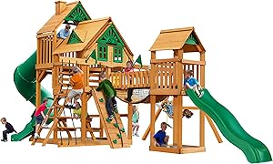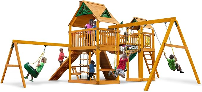 The Gorilla Playsets Pioneer Peak Treehouse Cedar Swing Set brings excitement and adventure to your backyard with its combination of fun features, including a Tire Swing, Clatter Bridge and Tower, and Deluxe Climbing Ramp. Designed for children aged 3 to 11 years, this playset is constructed from premium cedar wood, ensuring durability and long-lasting enjoyment. The set includes interactive play elements such as a Tic-Tac-Toe panel, a spacious play deck, and the one-of-a-kind 360-degree Turbo Tire Swing. It’s perfect for energetic kids looking to explore and have fun!
